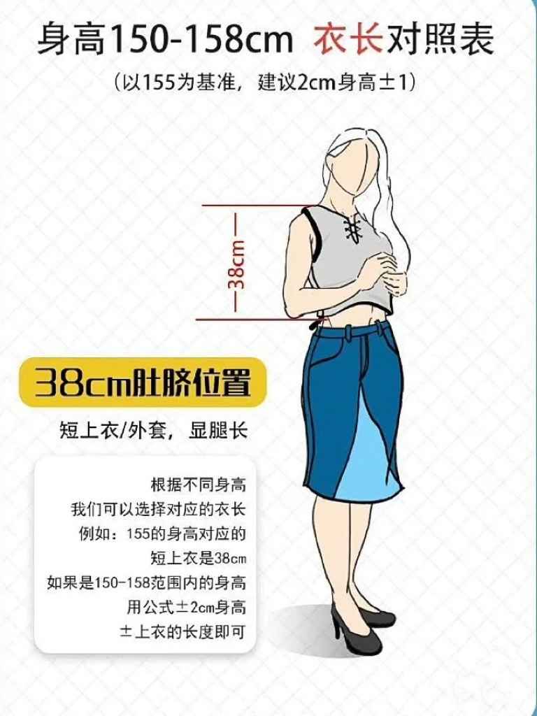 喜欢短上衣或短外套的话,建议选38cm左右,长度在肚脐位置,能拉高腰线,穿出热辣又显高的效果。