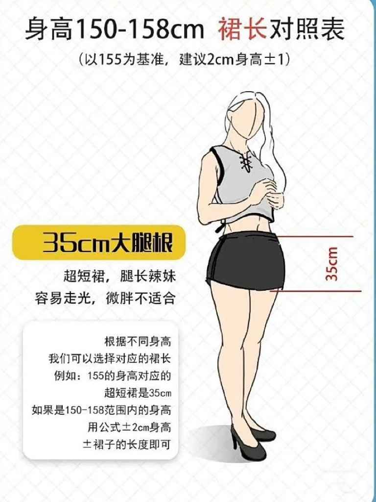 短裙的话,建议选35cm左右,刚好到大腿根部,适合身材苗条的小个子。如果微胖女孩穿这个长度,容易走光哦。