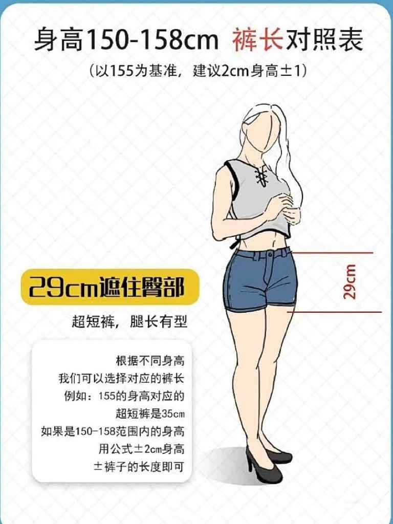 超短裤建议选29cm长,刚好遮住臀部,显得腿又长又直。很多女孩一年四季都爱穿热裤,但记住不是越短越好,太短容易暴露大腿肉肉。
