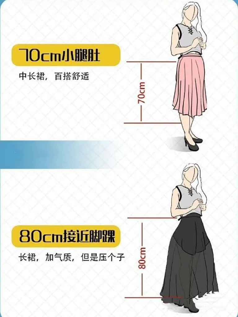 如果想穿80cm左右的及踝长裙,虽然显气质,但最好配细高跟,避免显矮。