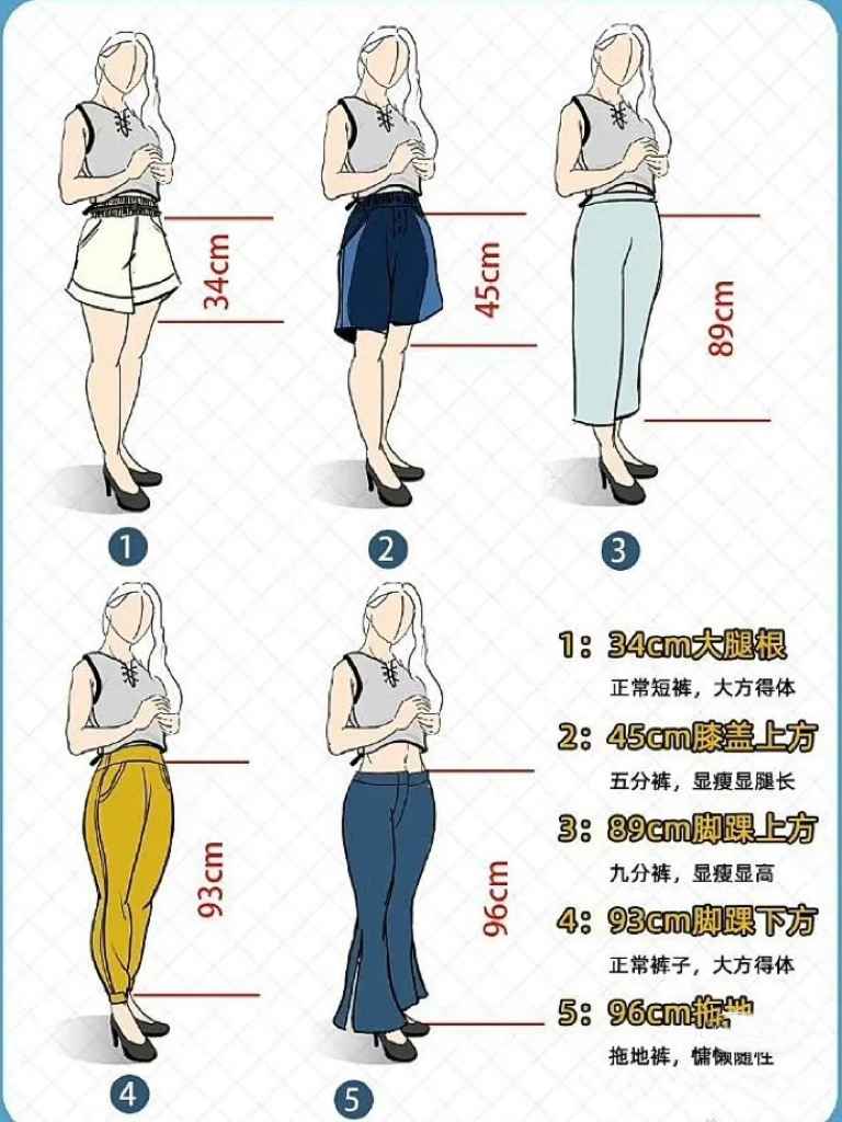 小个子适合的裤长有五种:34cm短裤,到大腿根,得体大方;45cm五分裤,在膝盖上方,中性帅气。