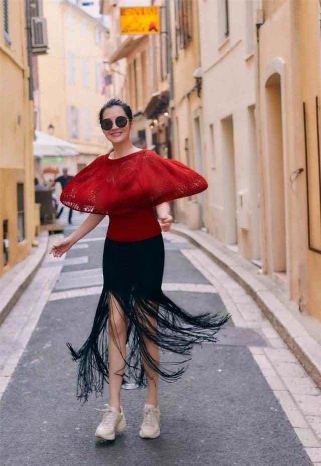 这件红色上衣设计感十足,日常穿可能有点夸张,更适合拍照或特殊场合。上衣廓形宽松,下摆展开幅度大。下身搭配黑色流苏裙,红黑配色经典不过时,流苏元素增添灵动感。