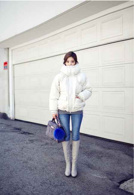 但咱也别瞎穿。紧身的小脚牛仔裤,我劝你最好收起来。除非你有超模那样又长又直的美腿,不然它分分钟暴露你的腿型缺陷,什么胯宽、小腿肚,看得一清二楚,跟白色羽绒服一搭,头重脚轻的感觉特别明显-1-10。现在更流行的是直筒牛仔裤或者微喇牛仔裤。直筒的能帮你把腿型“掰直”,显得笔挺利落;微喇的则在脚踝处有个小开放,带点复古调调,特别有味道-6-9。