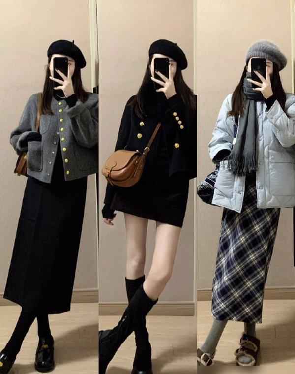 - 半裙搭配:A字中裙长度到小腿最细处,配220D以上的加绒连裤袜和过膝长靴。