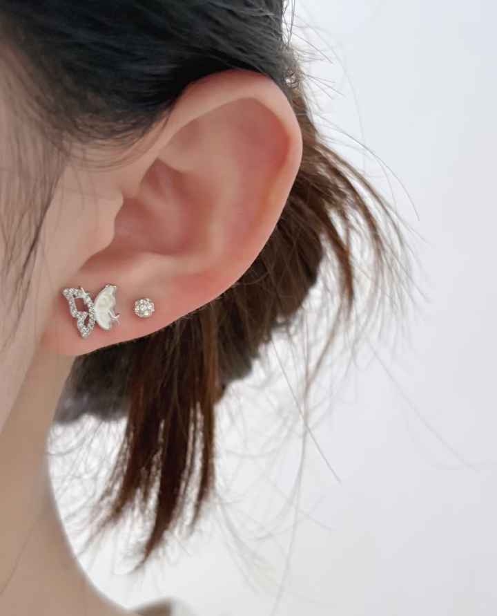 最后一款是我的最爱,上面的小耳钉是百搭钻石球,闪亮却不夸张,下面搭配稍大一点的蝴蝶设计。蝴蝶耳钉单戴也很美,镂空和贝母结合,设计新颖独特。