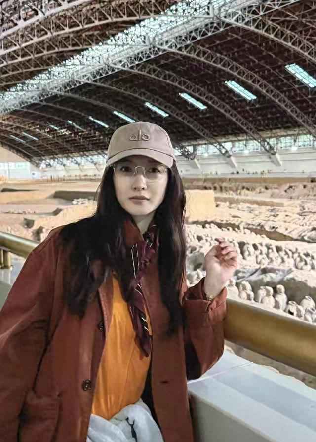江疏影西安观兵马俑,穿风衣带眼镜气质开挂,随手一拍都是大片