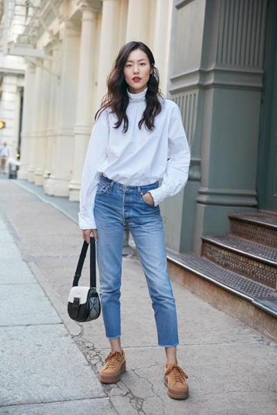 你知道吗,同样是一条直筒牛仔裤配乐福鞋,为什么别人像时尚博主,你就像下班遛弯?差别就在裤脚和鞋面的距离。穿乐福鞋时,把直筒裤的裤脚轻轻卷起,停在鞋口上方大约1厘米的位置,恰好露出最纤细的脚踝,这种“精致的克制”就是通勤装的灵魂-10。如果是搭配今年依旧很火的厚底“爸爸鞋”或“勃肯鞋”,那就选择裤长能盖住鞋面、但悬空鞋底0.5厘米的阔腿牛仔裤,那种慵懒堆叠的感觉,才是松弛感的顶峰-2-6-10。
