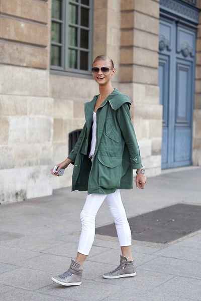 白色(尤其是奶白色):这可是“万金油”组合。清爽的白色能瞬间提亮军绿色的沉稳,显得人干净又精神-2-10。无论是简约的白T恤、宽松的白衬衫,还是软糯的奶白色毛衣,都能和军绿色裤子组成“蓝天白云”般的和谐CP。记住一个小心机:把上衣塞一点进裤腰,明确腰线,比例立马变好-10。