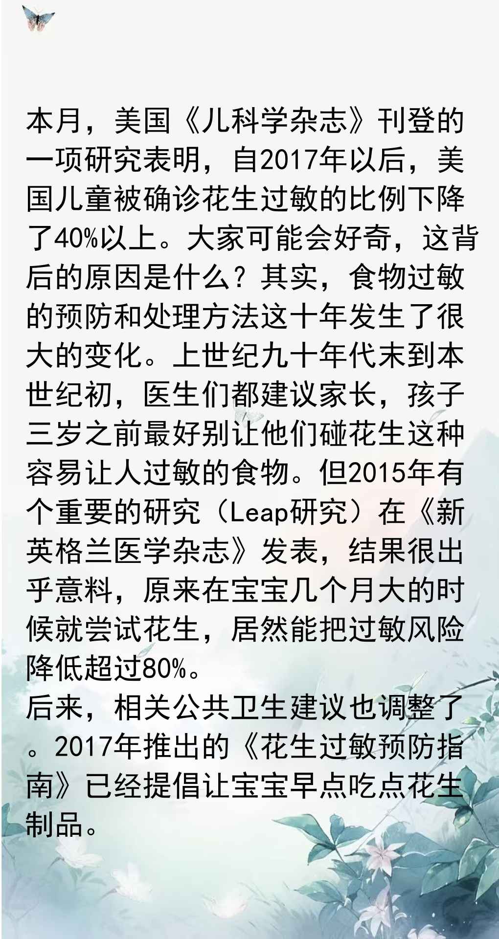 还记得咱们小时候吗?花生在乡下可是家常便饭,家家种地都存着好几袋。那会儿谁听说过花生过敏啊?孩子们直接用手剥开花生,沾着泥土就吃,压根没事。可如今,网上总传美国娃吃一口花生酱就得送急诊,我起初还觉得是夸张。直到最近翻医学文章,才发现花生过敏真成了全球爸妈的头疼事。美国以前在食物过敏上特别小心,90年代的指南直接让宝宝三岁前别碰花生。结果呢?过敏率不降反升,尤其是那些讲究干净的中产家庭,免疫系统反而被惯坏了。2015年有个重磅研究叫LEAP,证实了早点让宝宝尝试花生,反而能大幅降低过敏风险。当时整个医学界都炸锅了,老观念一下子被推翻。有趣的是,指南改了就几年,美国儿童的花生过敏率真的开始下降。我查了美国《儿科学杂志》今年六月的最新报告,从2017年起过敏率掉了超过40%,很多医院和学校的数据也印证了这点。爸妈们的焦虑总算有了科学依据。可惜国内很多科普还走老路,家长总觉得晚点吃更安全。其实啊,免疫耐受有个黄金窗口期,错过了反而容易出问题。现在有专家建议用花生粉混在辅食里,慢慢来,每周试几次。只要注意宝宝的第一反应,轻微皮疹通常没事,严重过敏极少见。饮食习惯、遗传基因、环境因素这些都会影响过敏情况。美国花了二十年才达成共识,中国家长可能还得摸索一阵。吃花生这件小事,背后其实是“过度保护”和“适时适应”的平衡。你家宝宝第一次尝花生时,你是不是也紧张得不行?