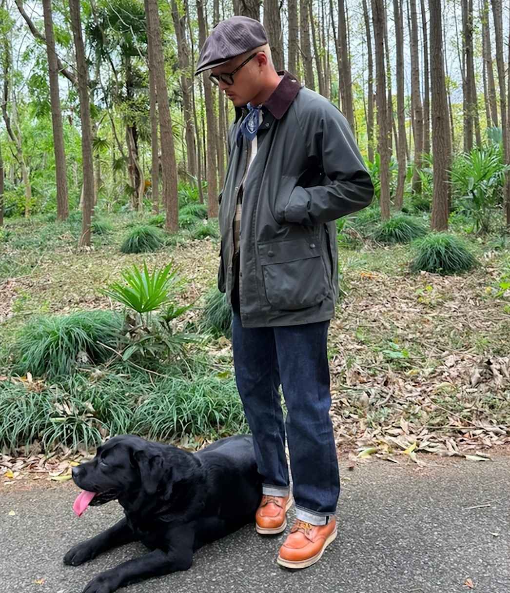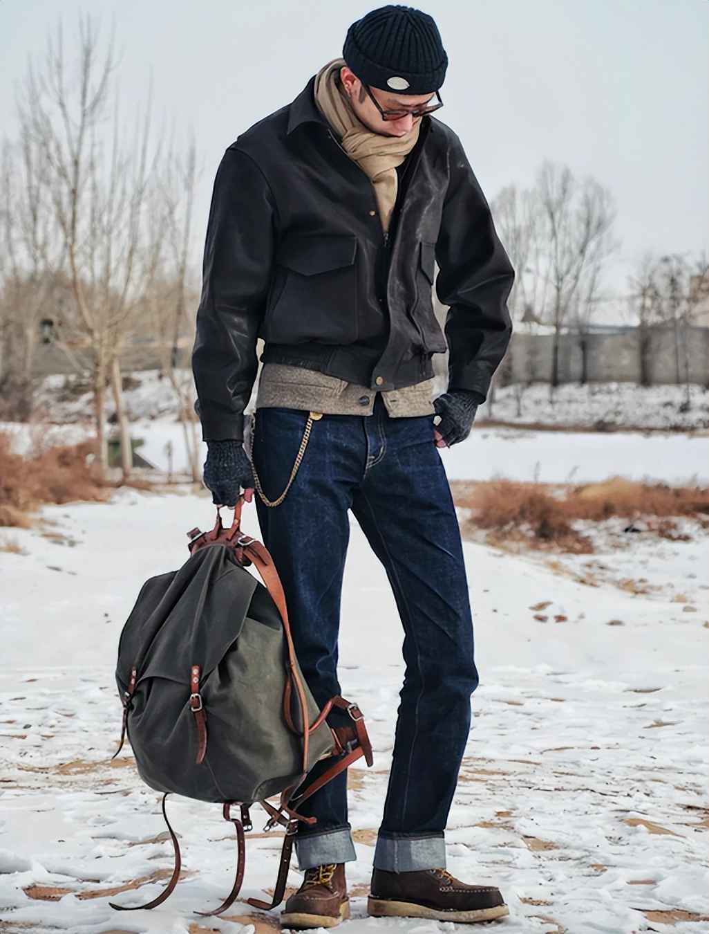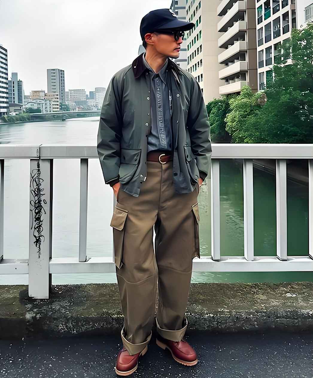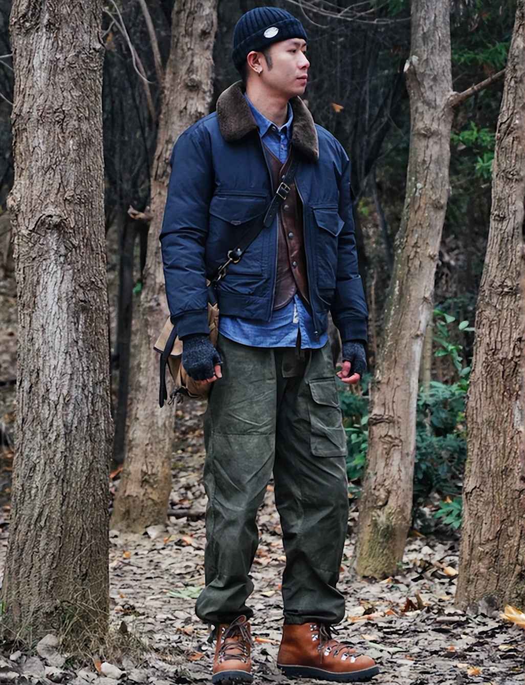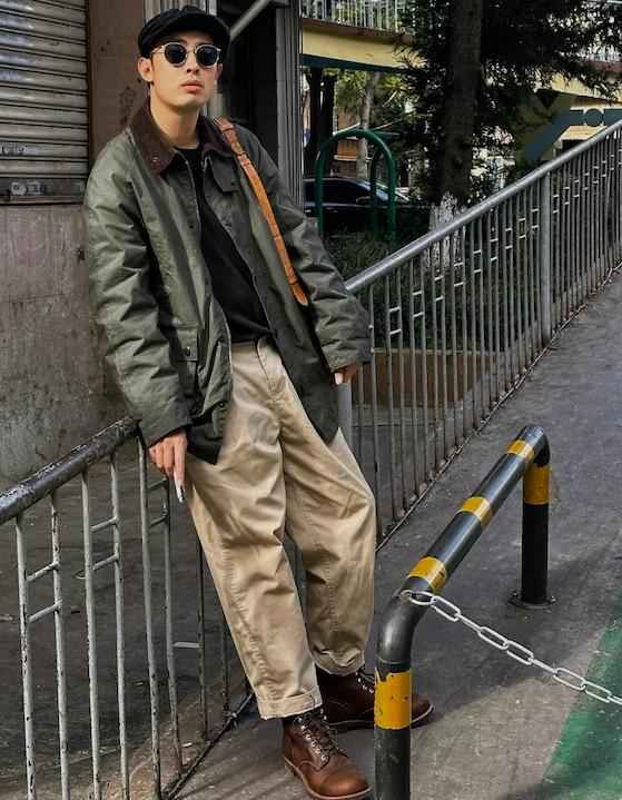 拼色夹克本身就有亮点,需要用靴子这类稳重单品来平衡。我的经验是:夹克的主色决定靴子的色系。比如灰蓝拼色的夹克配深灰靴子,卡其拼橄榄绿的配棕色靴子,整体协调又不失细节。