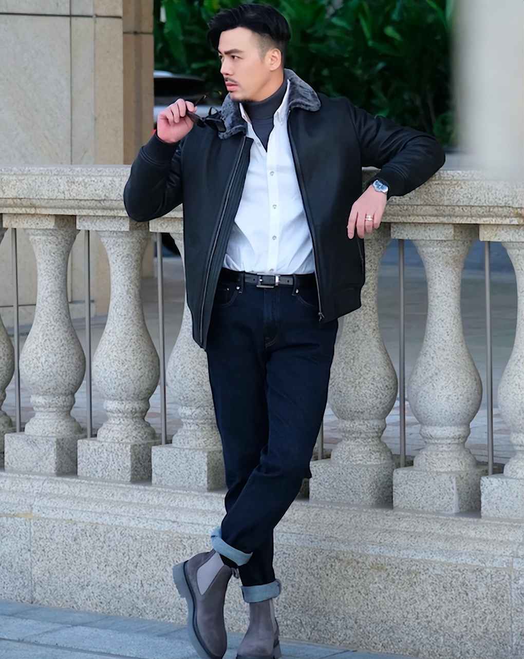 男生白色皮鞋穿搭秘籍:杭州大叔的“拼色领夹克+休闲靴”造型,轻松穿出高级男人味