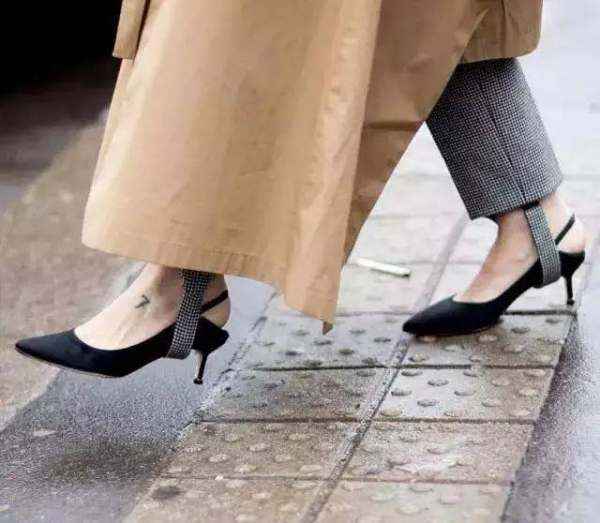 低跟(2-3厘米)的船鞋: 选哑光皮质、鞋头稍圆的款式,颜色选黑色、深酒红或香槟金,非常稳重大方,走路极稳。