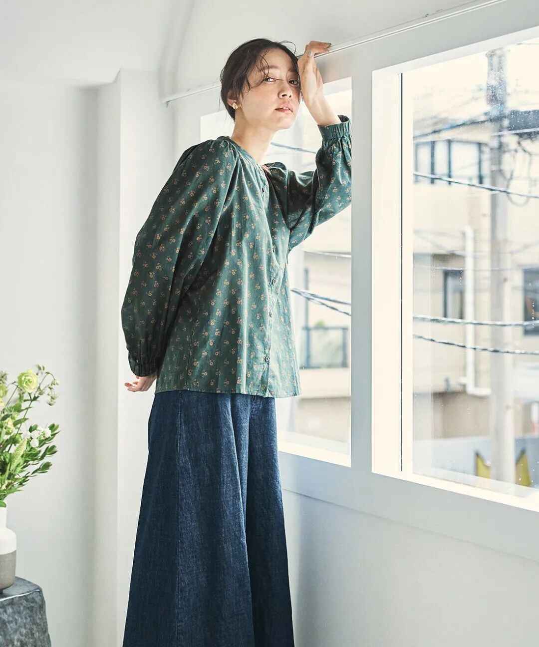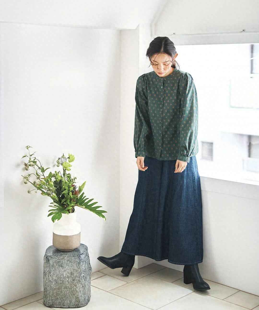 墨绿色的无领衬衫,充满了大自然的活力与清新感,还带着复古的韵味,配上一条牛仔中长裙,轻松打造出休闲又自然的森林风格。