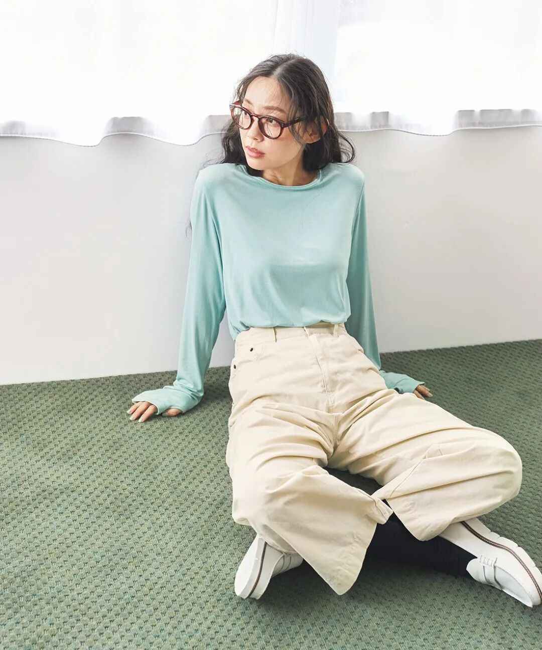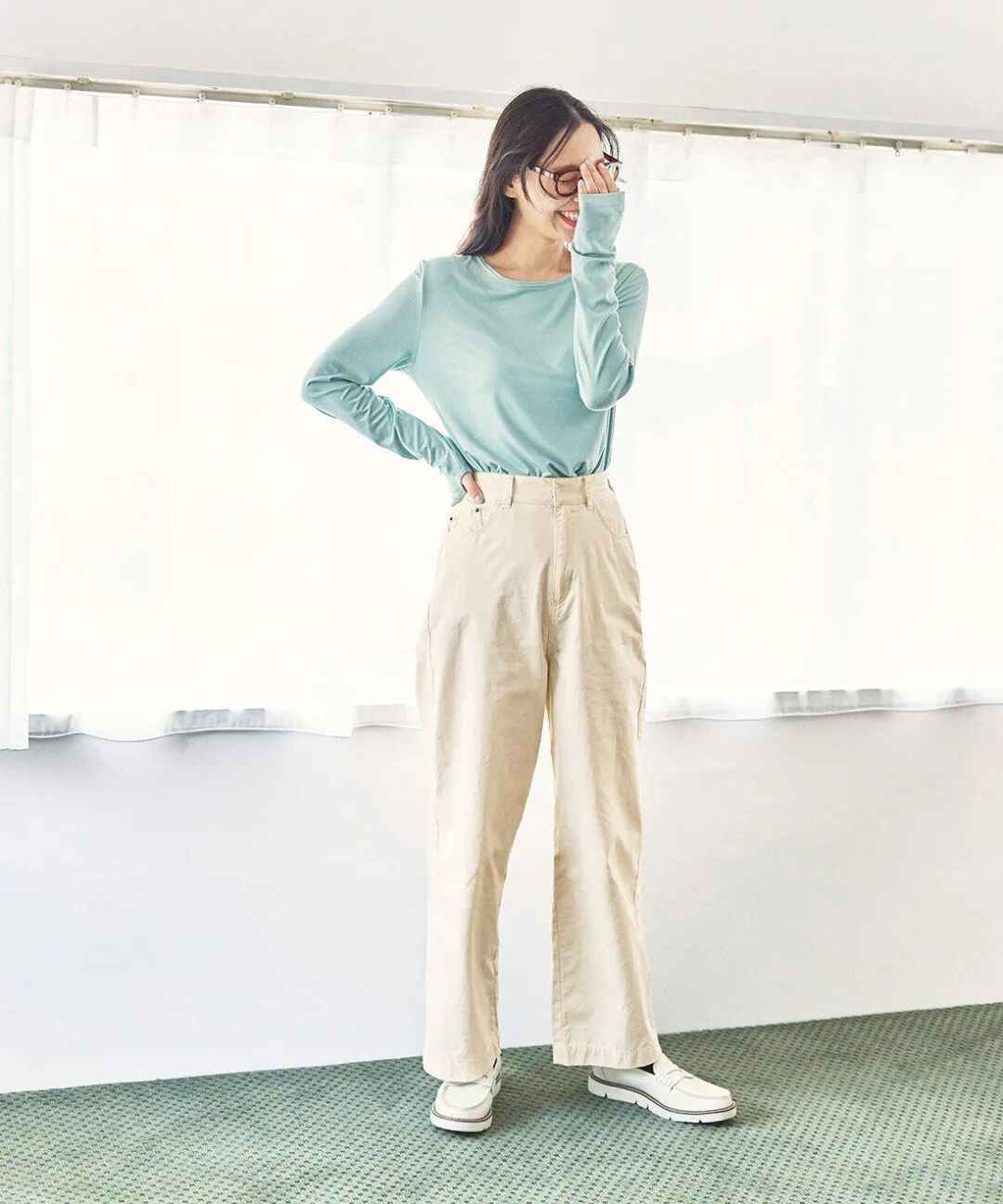 薄荷色的上衣透出清凉感,仿佛能闻到森林里湿润的草木香,搭配米白色裤子和百搭小白鞋,整体看起来大方又舒服。