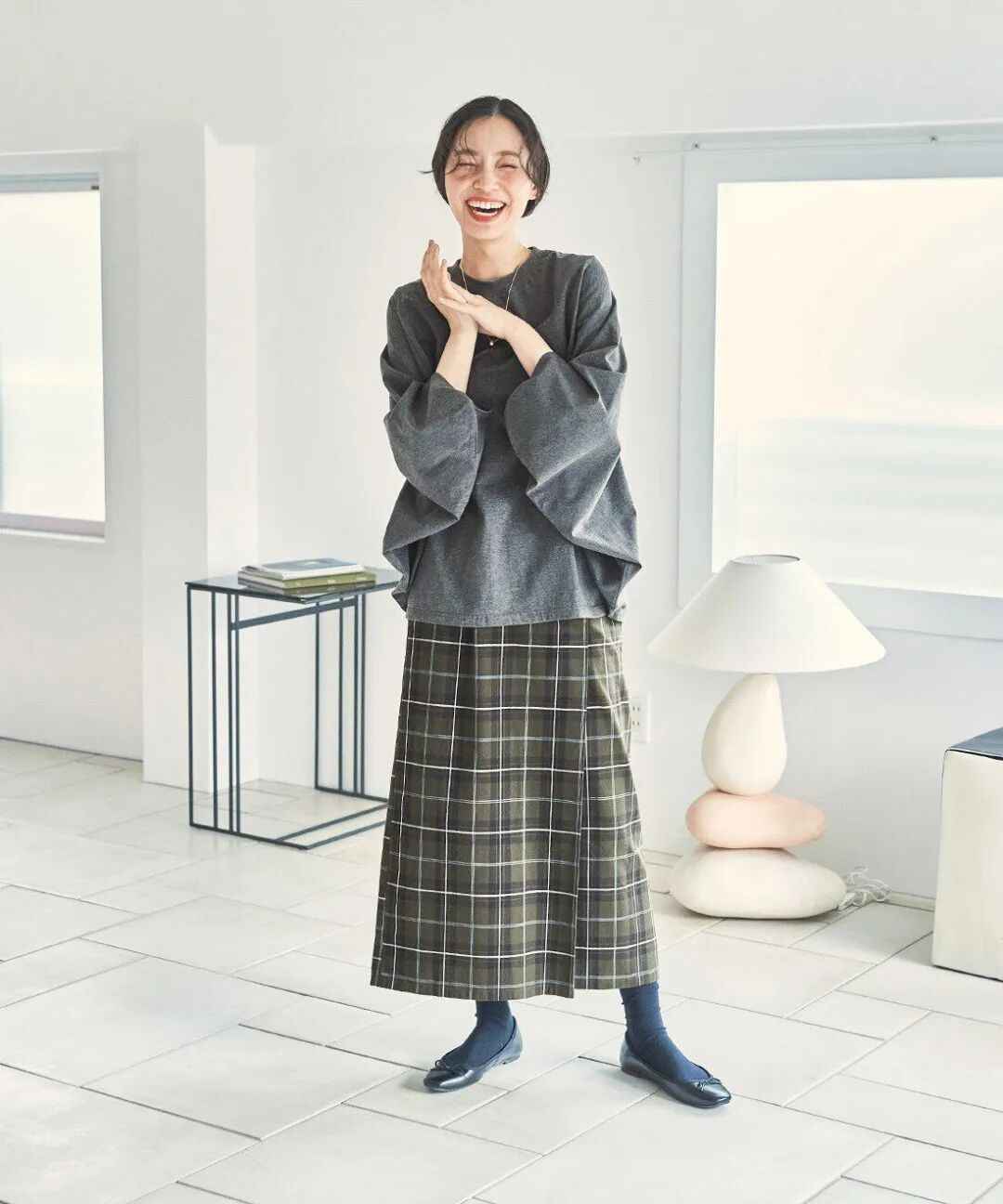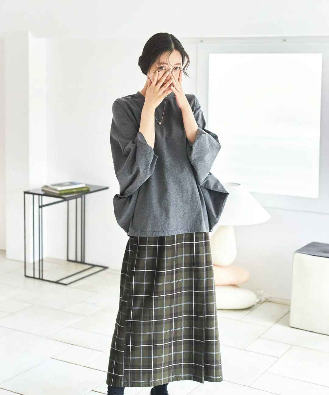 素雅的灰色上衣低调又耐看,蝙蝠袖的设计为基本款增添了新意,搭配格纹半裙,充满了大地的温暖感,秋冬氛围瞬间拉满。