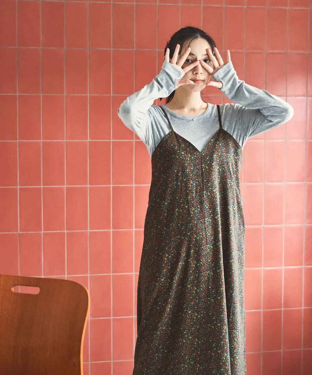 灰色打底衫低调舒适,不抢风头,搭配色彩柔和的碎花吊带裙,打造出不经意的美感。