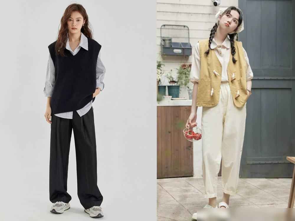 那选材质轻薄点的,比如棉麻衬衫配针织小马甲,两层加起来都比一件厚T恤轻,哪里会显壮?