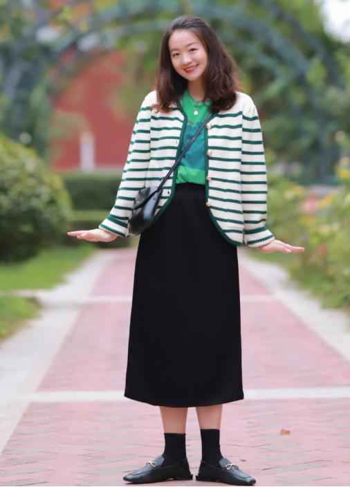 秋天微胖妹子可以多穿针织衫,选宽松版型更藏肉。比如这件条纹开衫,绿色条纹清新又活力,一点不显老,搭配牛仔裤或裙子都好看。