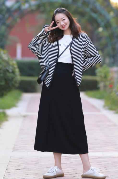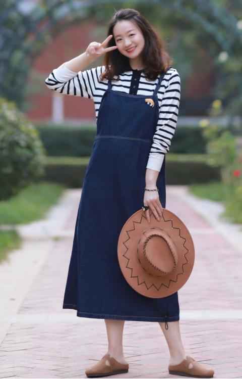 吊带裙不只是夏天专利,初秋搭配条纹衫穿,比如黑白色条纹衫加牛仔吊带裙,叠穿出来层次感强,活力十足,微胖女孩穿超减龄。