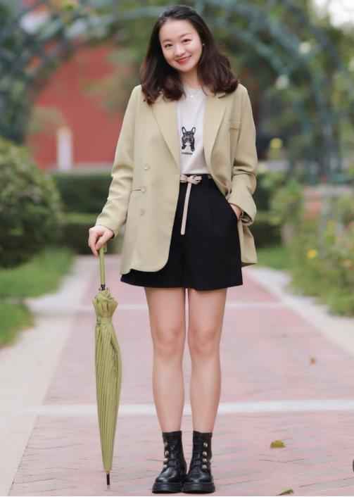 下面这身搭配用西装和短裙组合,露出大长腿,整体清爽又时尚。