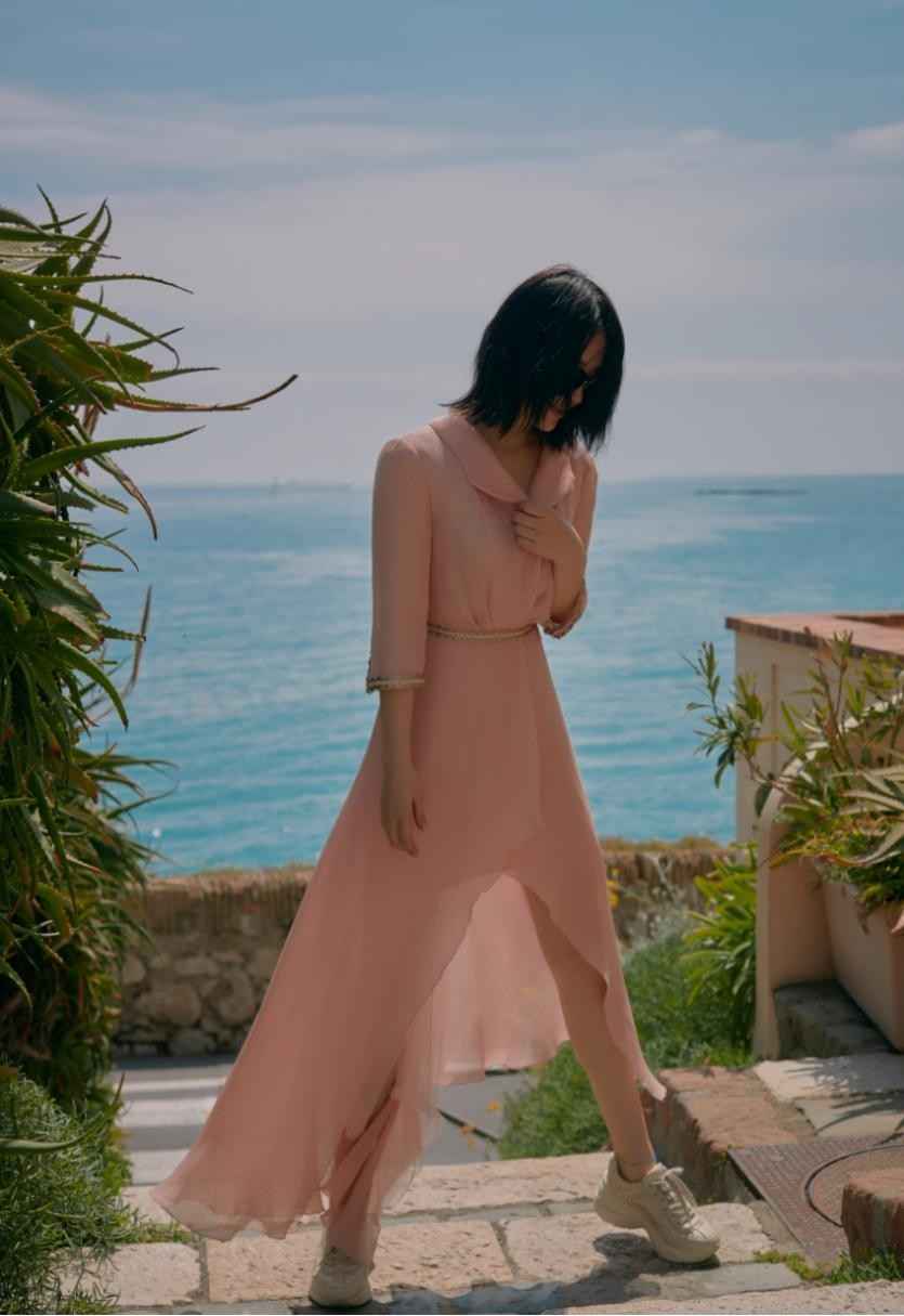 这条连衣裙颜色低调,不挑肤色,适合更多人穿。腰部收紧设计能轻松显出细腰。裙摆前短后长,视觉上拉长身高,更显高挑。