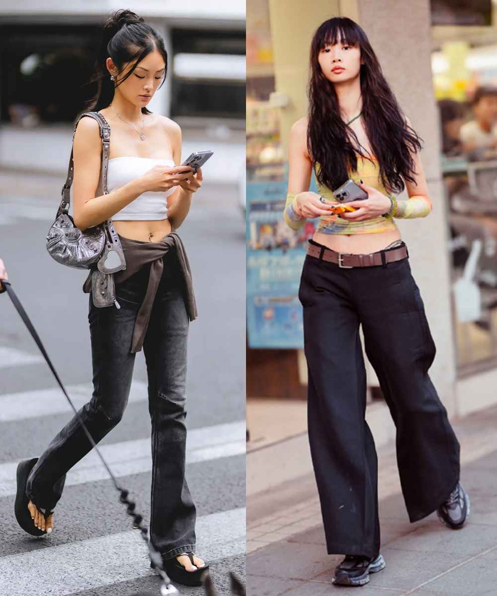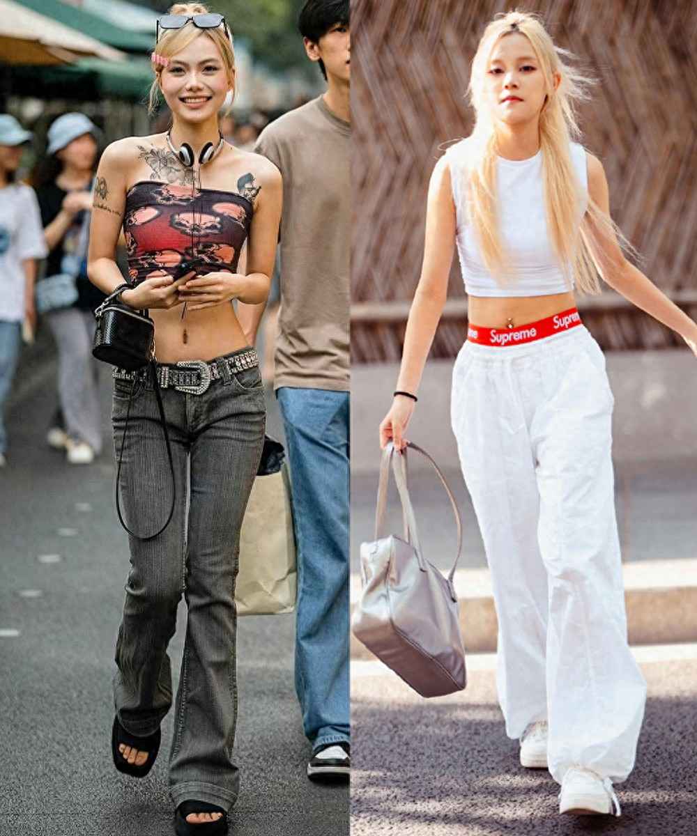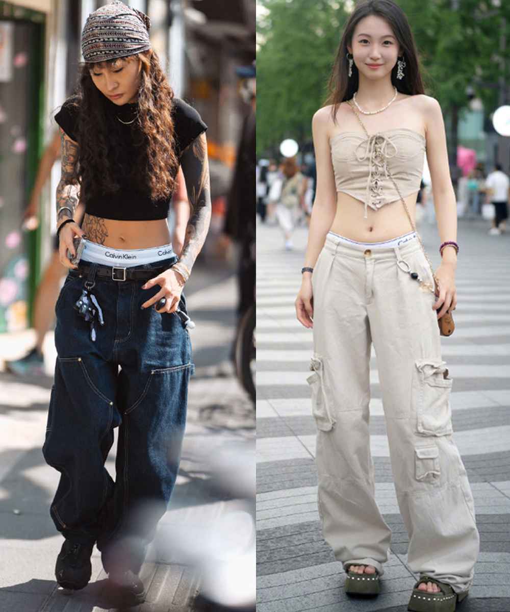 “内裤外露”穿搭得靠合适的服装来支撑,上衣不能太长,下装腰胯部分不能太高,否则就没法留出空间露出内裤边。