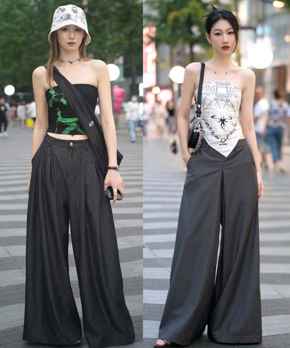 下半身尽量搭配长裤或长裙,比如现在超火的阔腿裤,就特别适合胸衣外穿,把视觉焦点集中在上半身,显瘦又时髦。