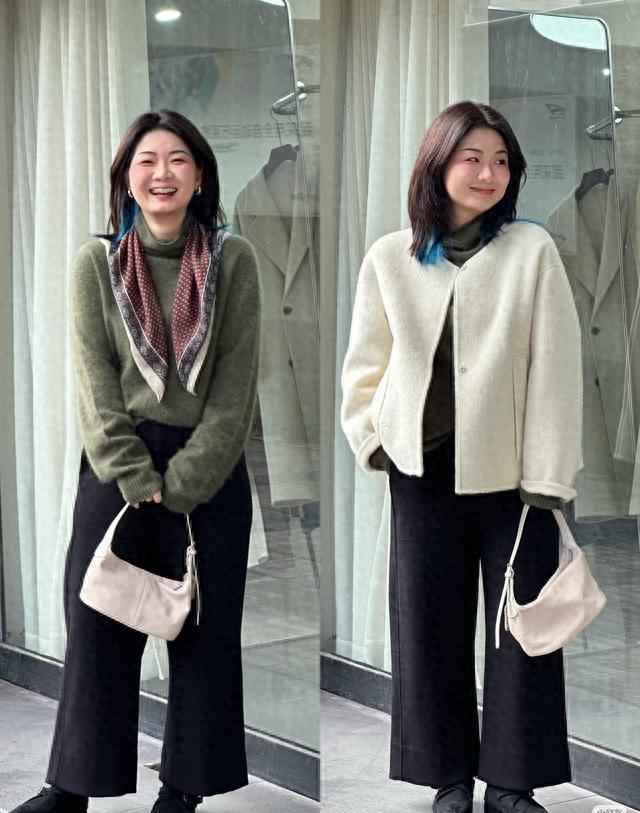 周舟选的是深苔绿色,不是黑色。短视频里黑色容易糊成一片,深苔绿在灯光下能保留阴影层次,还比黑色多了点活力。她外套是短款黑西装,袖口翻出绿针织衫的边,两件单品色差不到30%,但小面积层次感十足,平台算法会把这种“同色系微差”判定为高级搭配,额外给流量奖励。