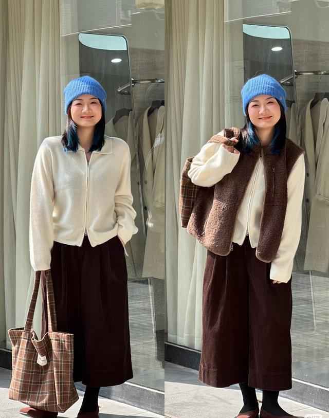 周舟用软尺量过,她胸下到肚脐是11厘米,肚脐到胯骨是9厘米,她把针织衫下摆停在胸下3厘米处,这里是身体最窄的部分,衣服一卡,腰线就定住了,再配上高腰微压裤的3厘米宽腰头,裤腰直接提到肋骨,整个人重心上移,视觉上腿长瞬间加分。