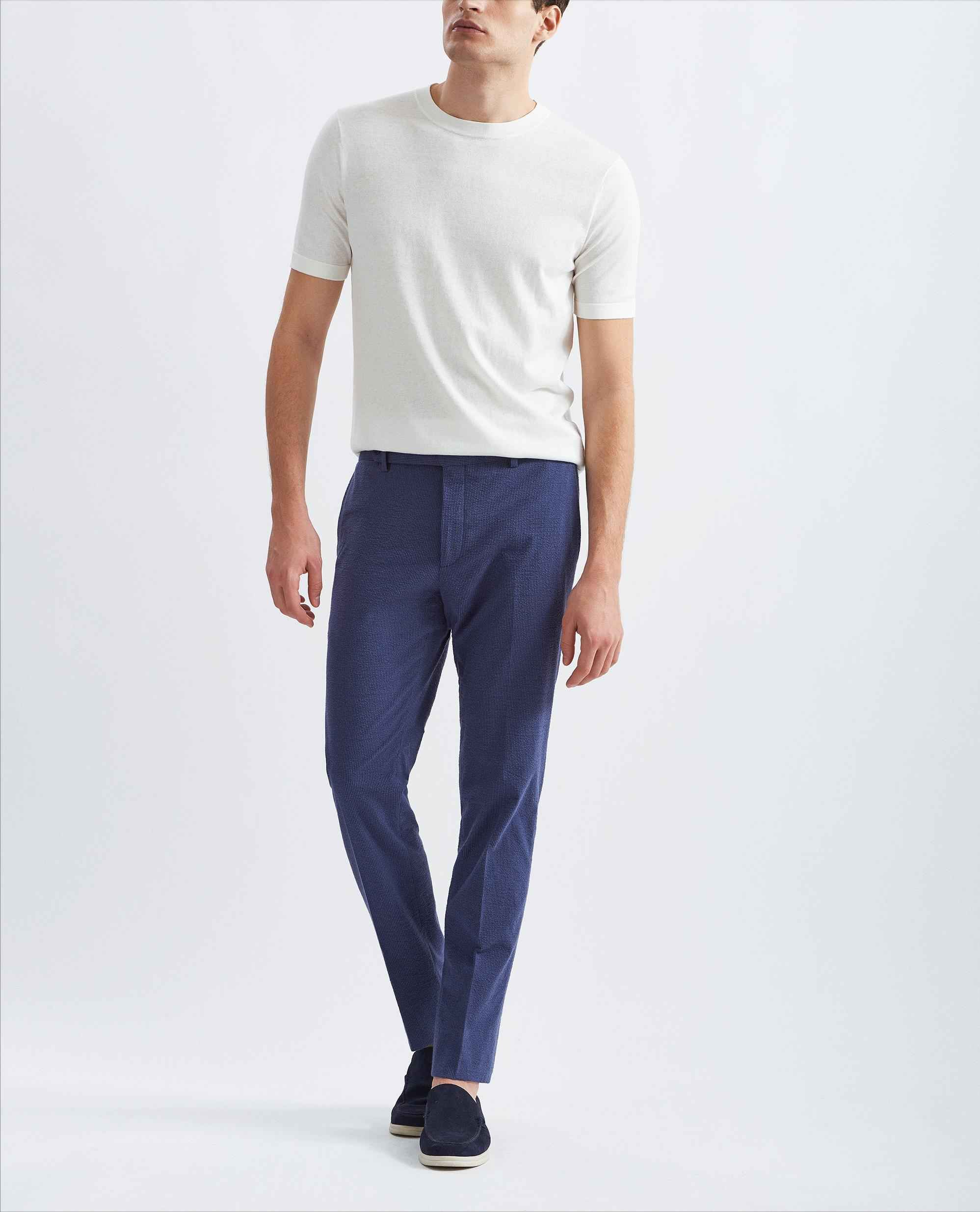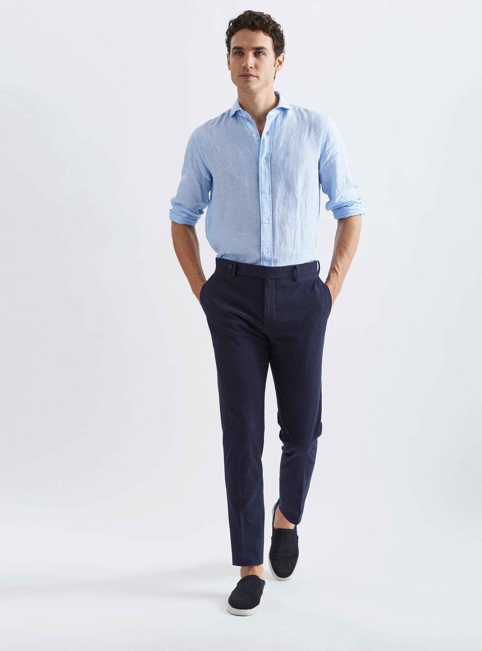 泡泡纱西裤配衬衫是经典组合,尤其适合职场男士。选择藏蓝色泡泡纱西裤,搭配亚麻纯色衬衫,就能轻松展现干练商务风。