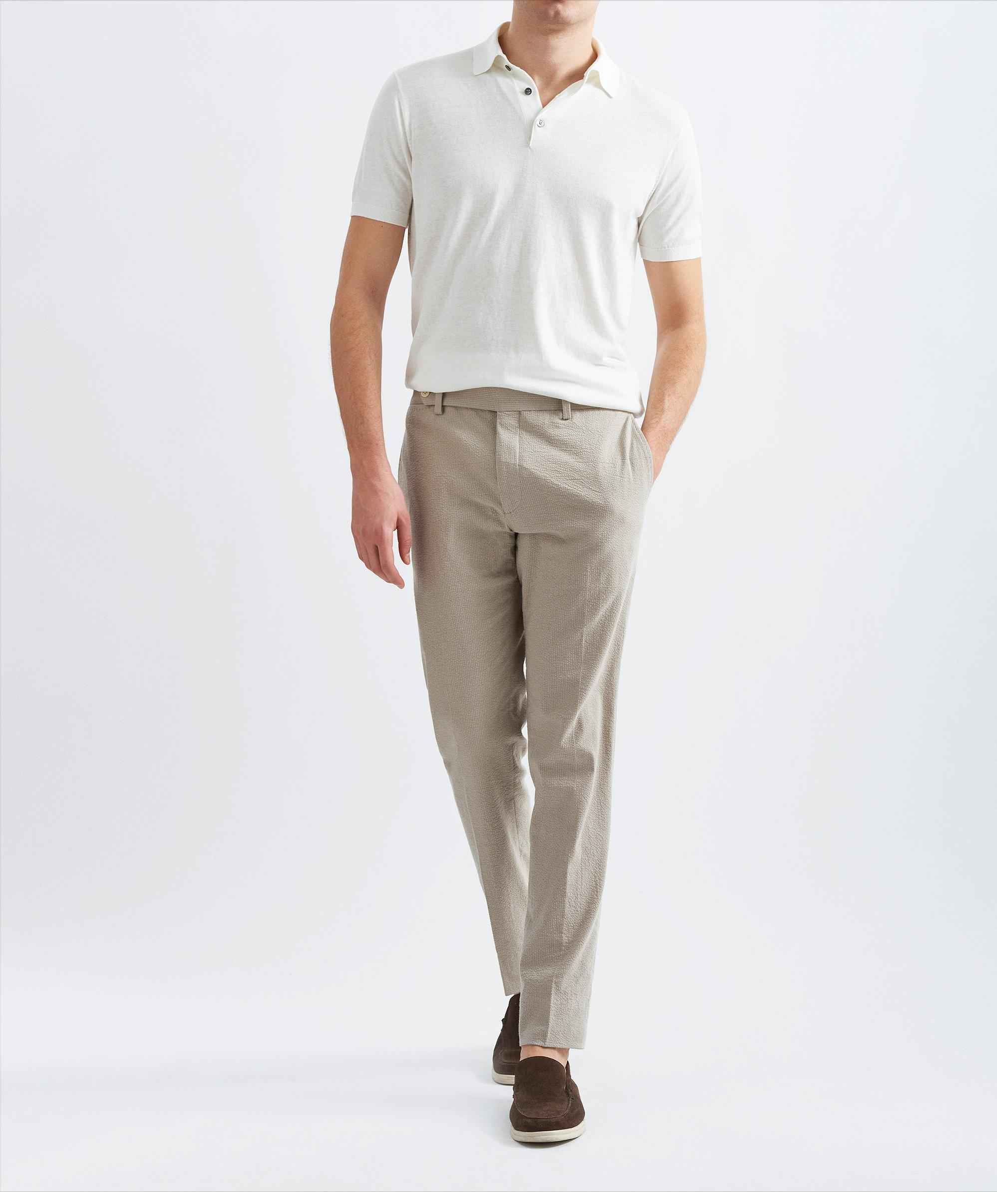 POLO衫是绅士衣橱的常客,与泡泡纱西裤搭配相得益彰。简洁剪裁和淡雅色调,能让造型看起来高级有型。