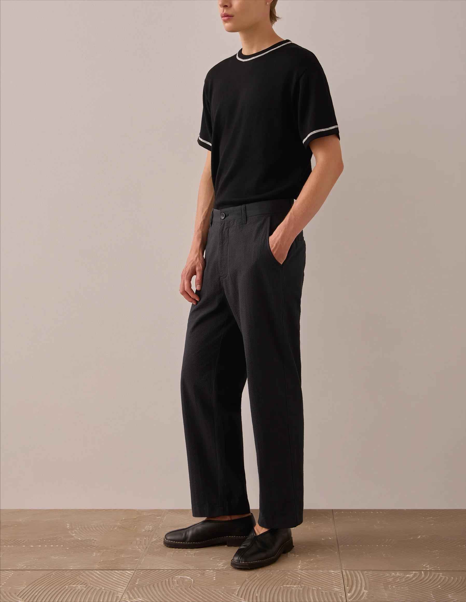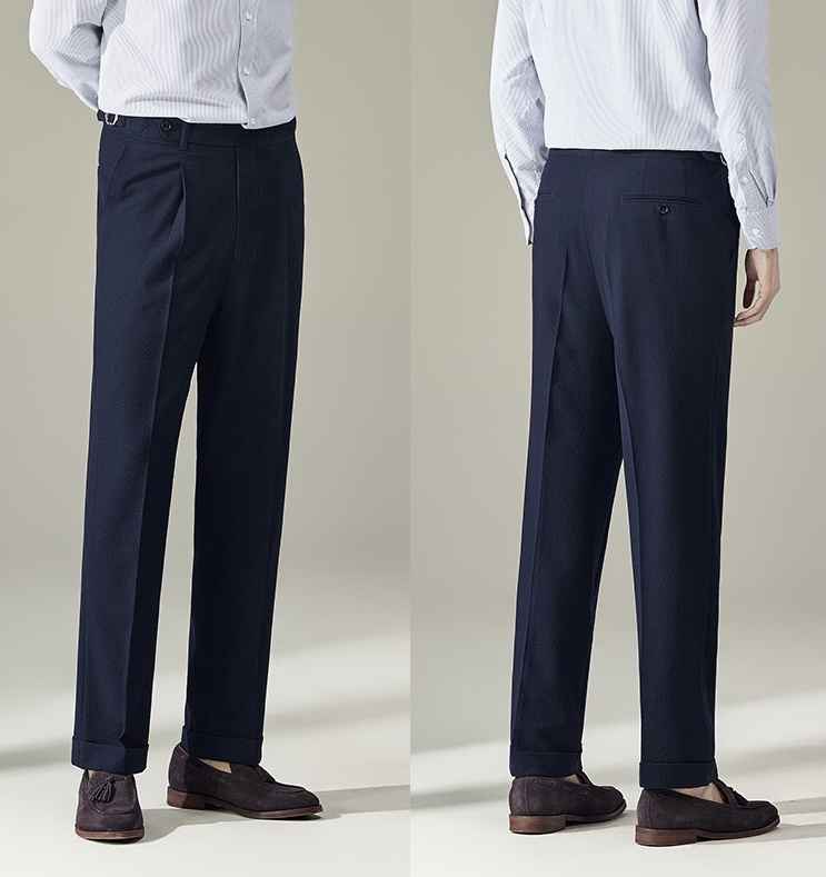 这款那不勒斯风格泡泡纱西裤,采用经典面料,耐用且舒适。腰部的褶裥设计增添层次感,让款式更显精致。