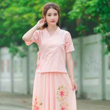 设计师们做得最多的是“减法”和“融合”。他们保留了斜襟、盘扣、提花纹样这些灵魂元素,但在版型上更加宽松自在,贴合现代人追求的舒适-8。传统的纹样被简化,融入更现代的面料;繁复的手工盘扣,有时也被隐形拉链替代,只为穿搭更方便-2。于是,我们看到越来越多的女孩,用一件斜襟盘扣的短袖上衣,搭配简约的牛仔裤或现代半裙,施施然地走在都市的街头-10。它可能是一件带有水墨泼墨意境的天丝短衫,清冷优雅-6;也可能是一件融合了书法笔触的棉麻上衣,悠然雅致-3。