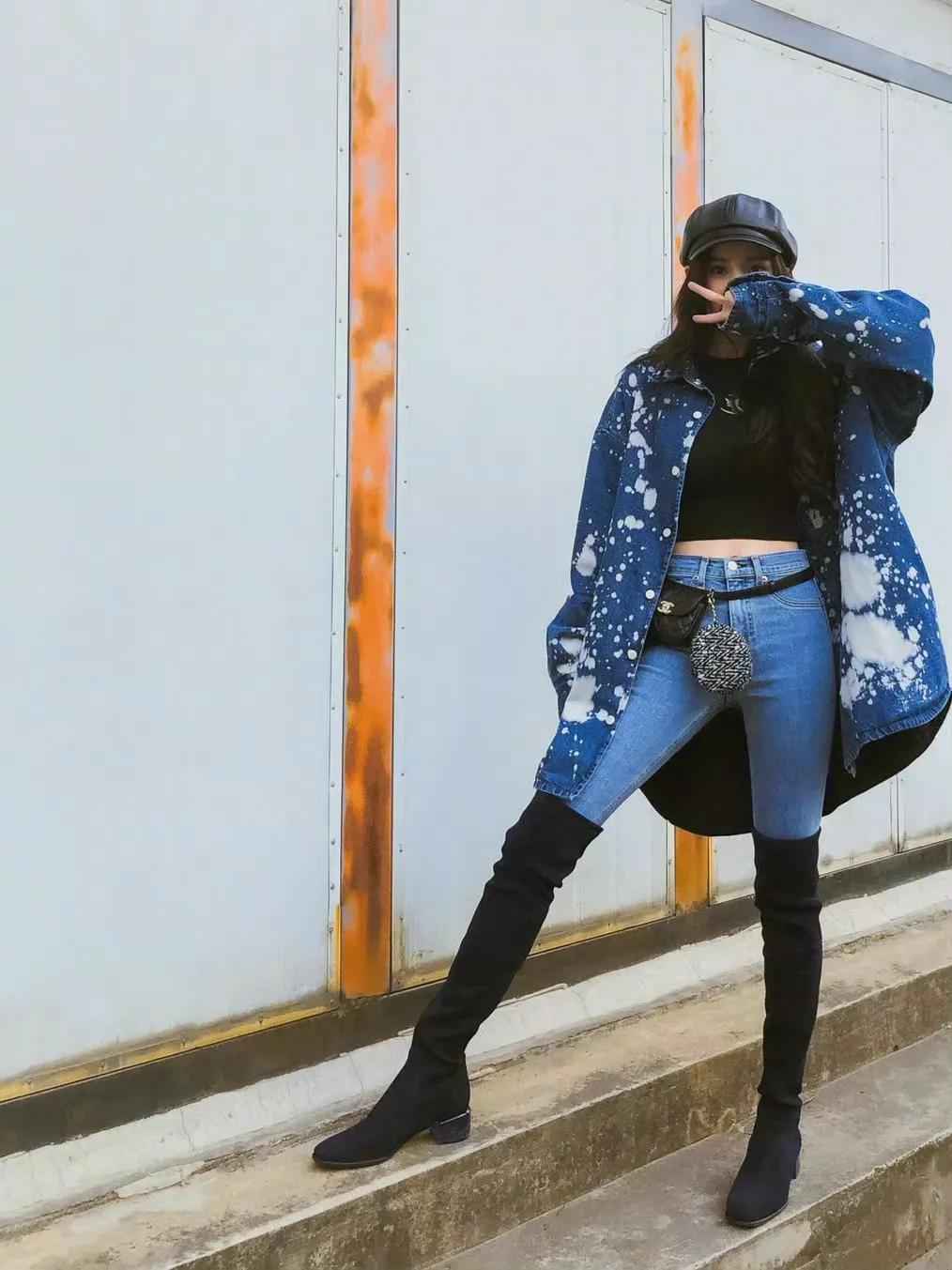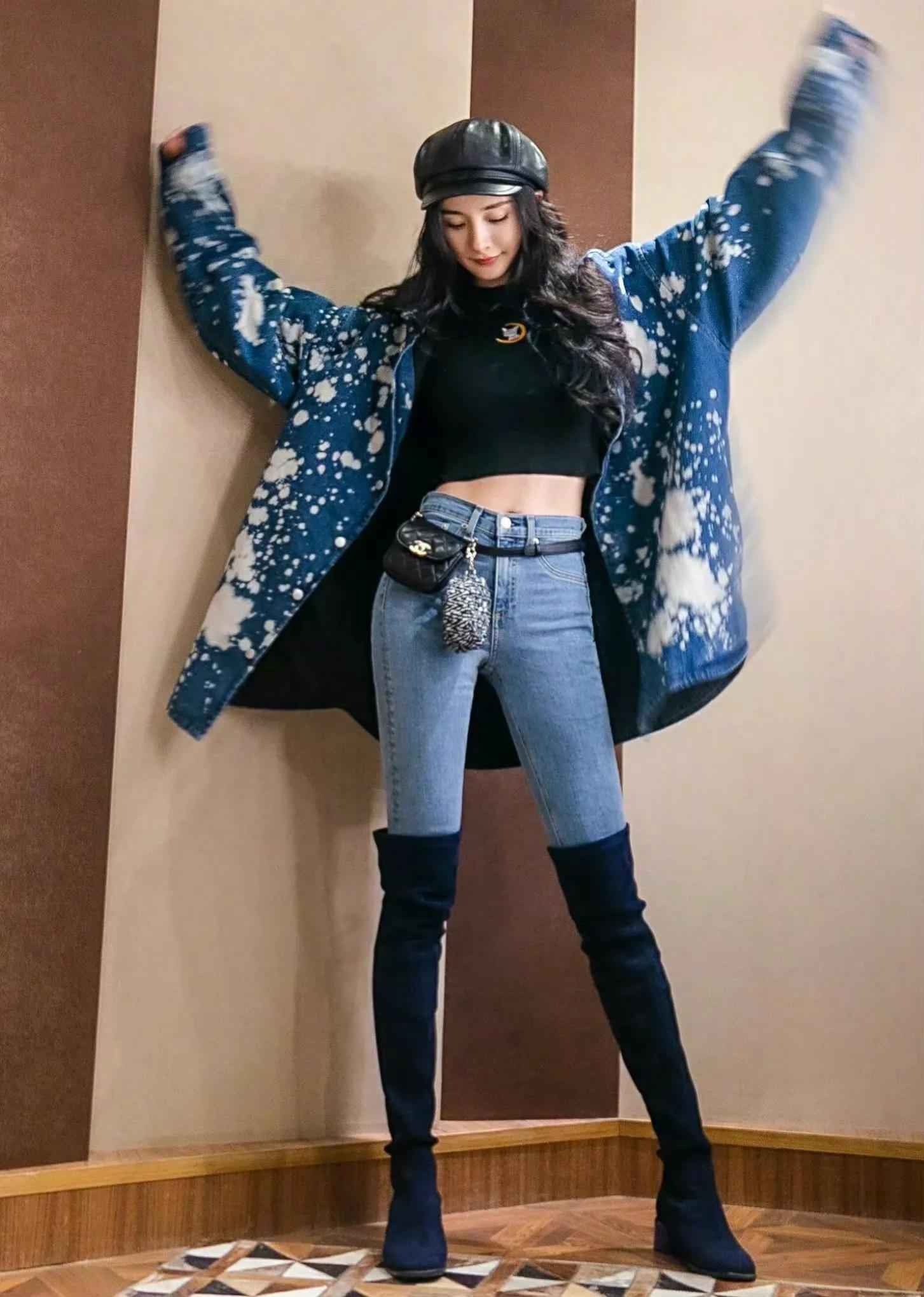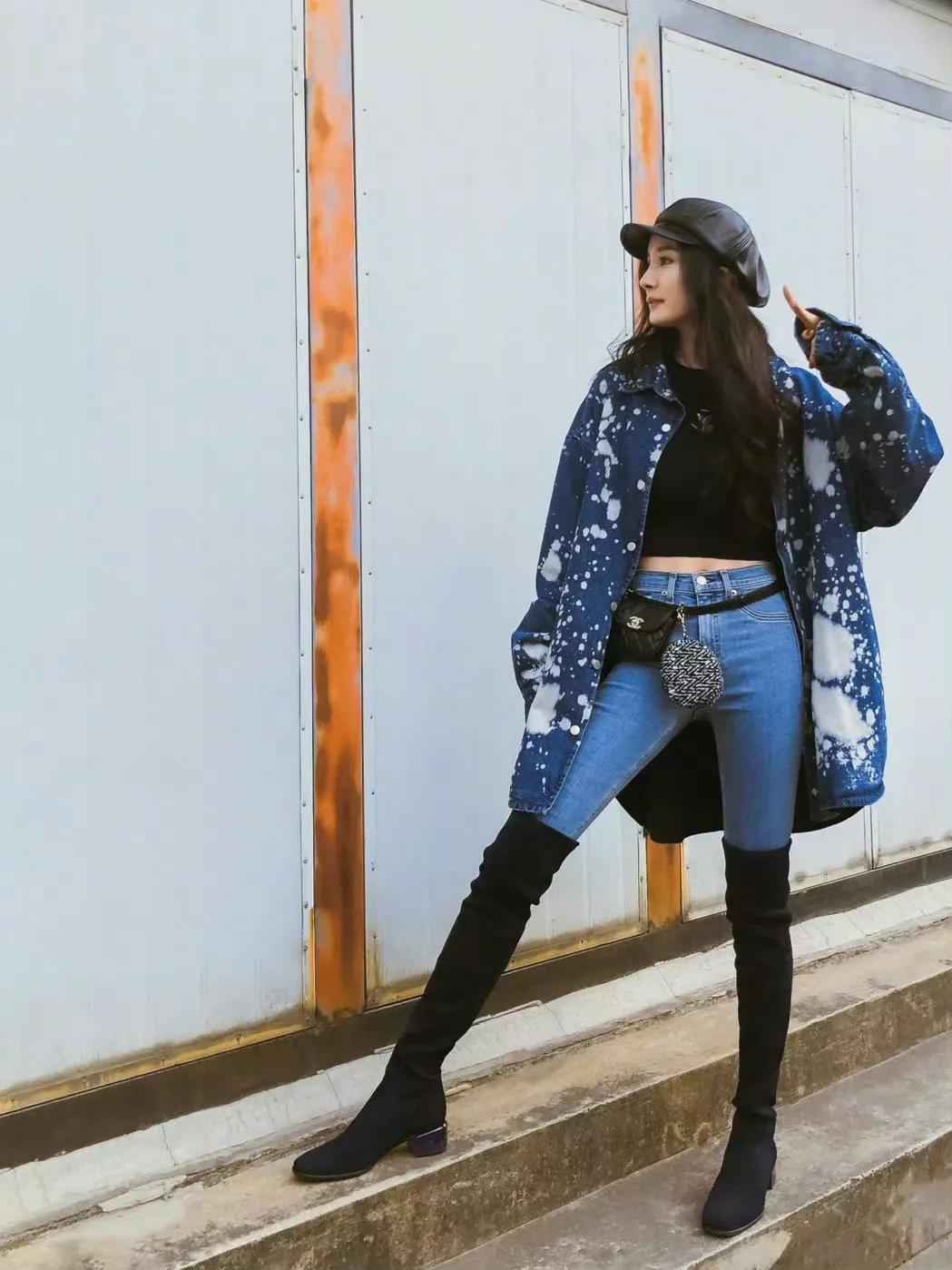 杨幂紧身牛仔裤穿搭秀:水蛇腰身材保养秘诀大公开