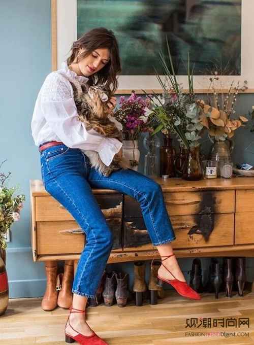 需要一点女人味和精致感的时候,玛丽珍鞋和尖头鞋就该登场了。觉得牛仔裤太中性?玛丽珍鞋的搭扣和圆头设计能注入满满的俏皮与甜美-6。配一条九分微喇牛仔裤,露出纤细脚踝,法式复古风信手拈来-5。而尖头鞋,尤其是小猫跟,则是拉长腿部线条的作弊神器-6。长一点的牛仔裤盖住一部分鞋跟,视觉上腿长直接“拉满”,还特别优雅-5。别忘了“自古红蓝出CP”,一双红色玛丽珍鞋或尖头小红鞋,能瞬间点亮全身牛仔造型,让你在人群中轻松脱颖而出-5-6。