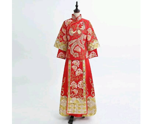 最顶级的叫做“褂皇”,金银线刺绣的密度接近100%,几乎看不到红色的底布,全身金光熠熠,华丽到极致,当然租金或定制价格也最为高昂-2。往下依次是“褂后”、“大五福”、“中五福”和“小五福”-2。刺绣密度越低,露出的红布部分就越多,气质也从极致华贵向喜庆活泼过渡。比如“小五福”,金线占比不到一半,红色为主,显得轻巧又亲切-2。很多新娘会折中挑选“中五福”或“大五福”,既有金银刺绣的华丽感,又有红色的喜庆均衡,拍照、行礼都很有质感,算是性价比之选-2。