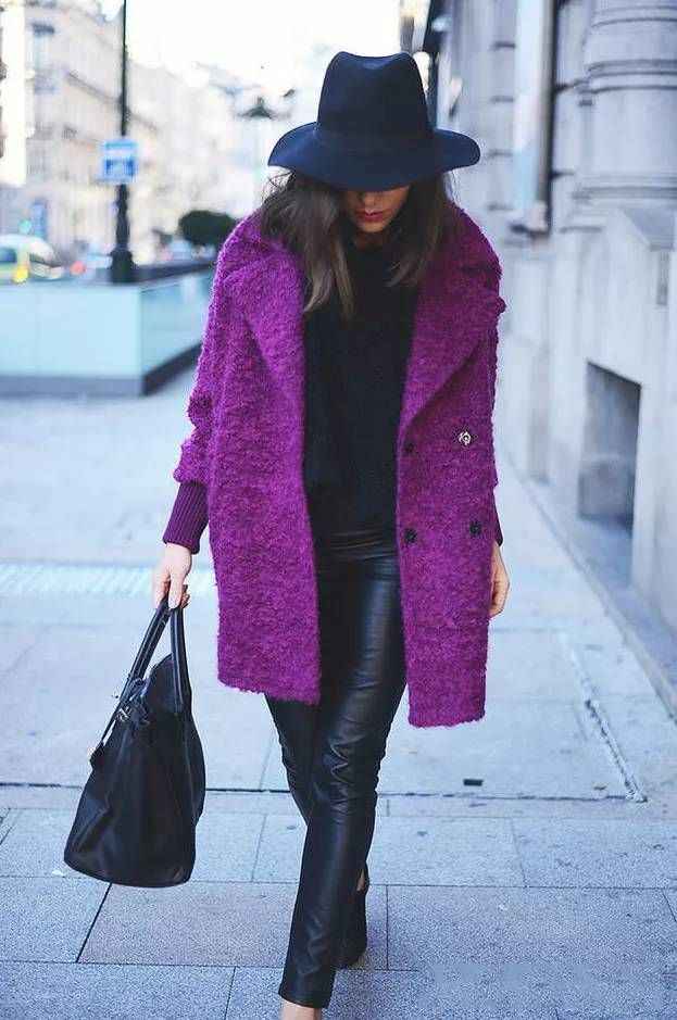 黑色外套:经典中的战斗机,神秘又稳重-2。当你内搭是深紫色或比较鲜艳的紫色时,一件剪裁利落的黑色大衣或皮衣,能完美压住场子,显得高级又显瘦。这招通勤、约会都妥妥的。